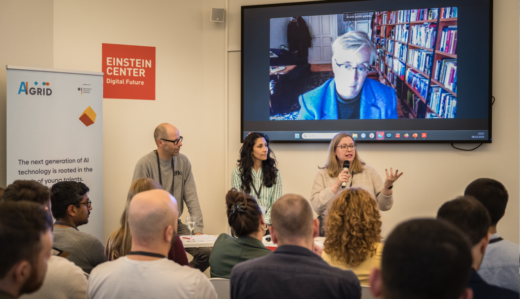 Nach einer Präsentation unseres Veranstaltungspartners, dem Einstein Center Digital Future, gehalten von Prof. Dr. Emmanuel Baccelli, folgte eine hochkarätig besetzte Podiumsdiskussion mit Prof. Dr. Joanna Bryson (Professorin für Ethik und Technologie, Hertie School Centre for Digital Governance), Irina Weiß-Avetisyan (Cloud- und KI-Strategie & Innovationsspezialistin, Technologique), und Dr. Katharina Weitz (Projektmanagerin, Fraunhofer HHI), moderiert von Dr. Aljoscha Burchardt (Principal Researcher, DFKI).